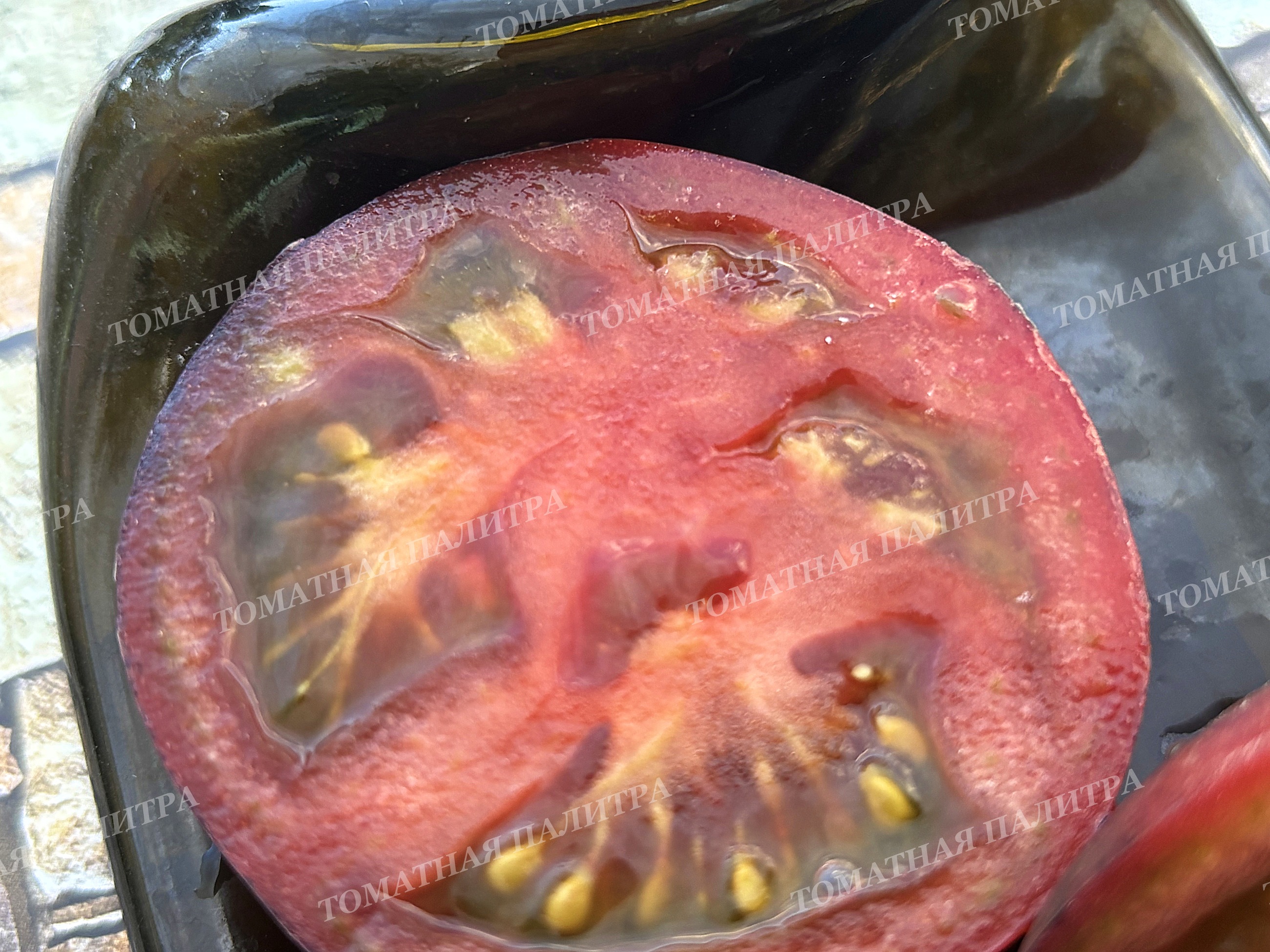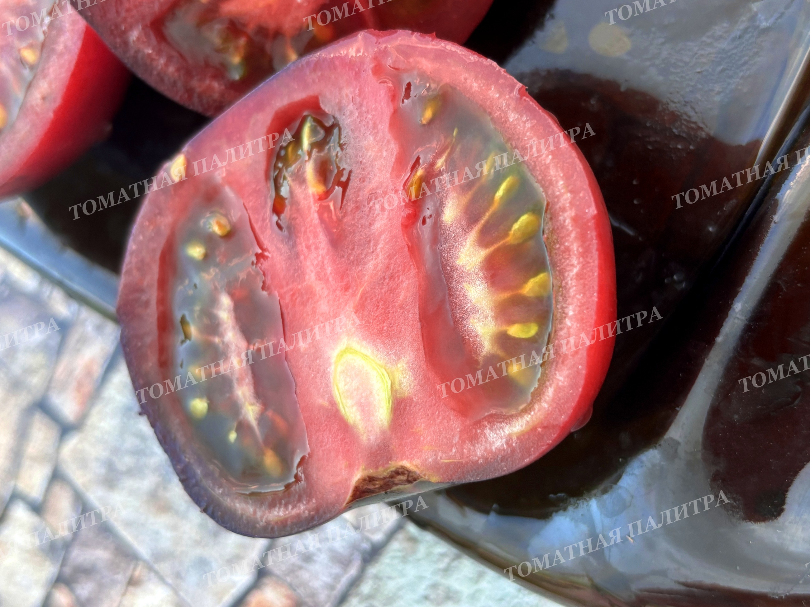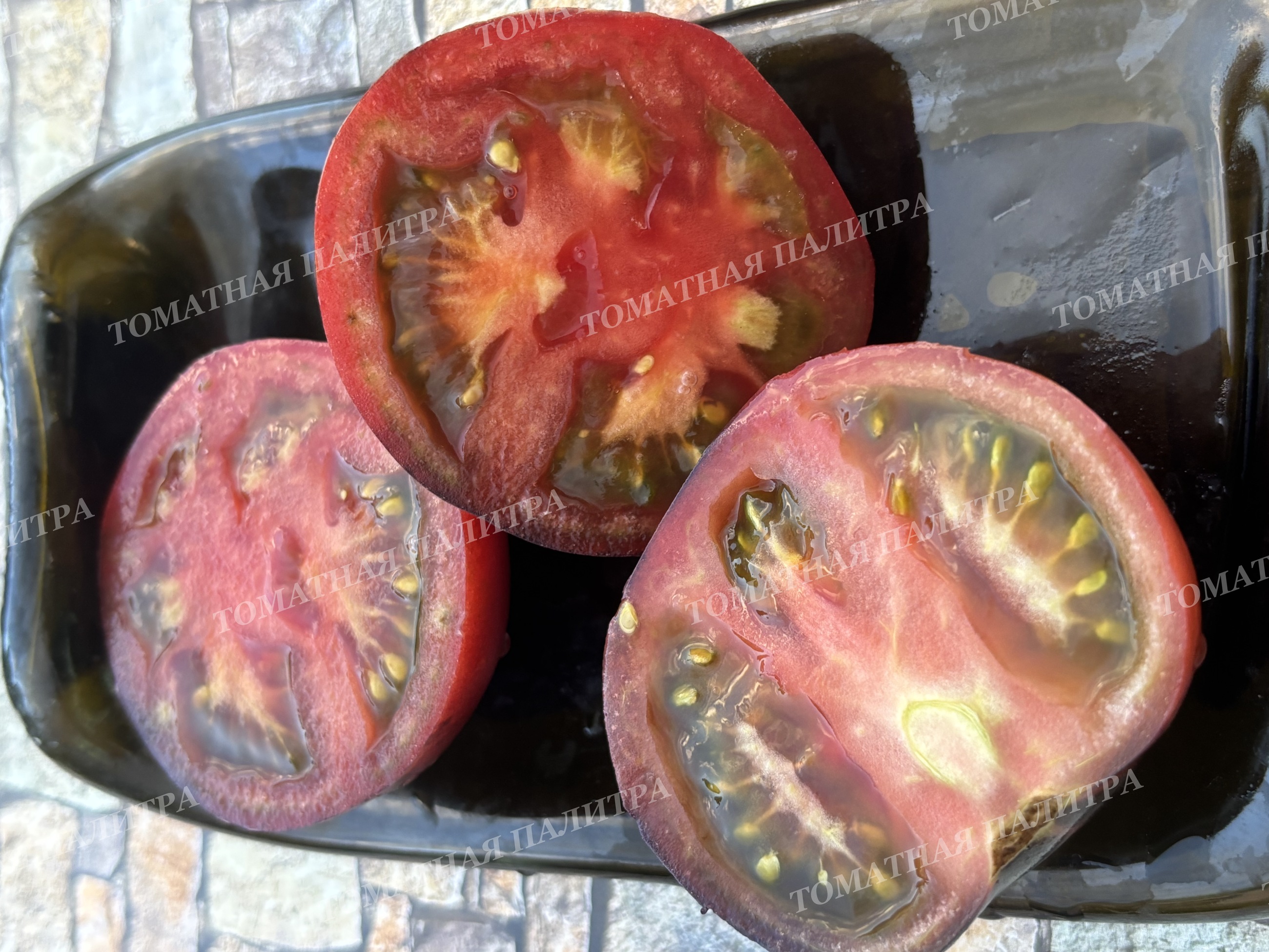 Мякоть очень сочная, с насыщенным классическим томатным вкусом домашнего помидора: со сладостью и небольшой кислинкой.