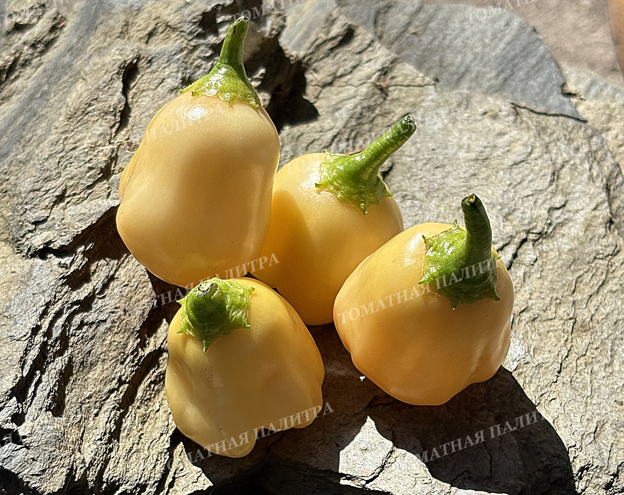 Перчины в виде разнообразных колокольчиков, весом около 10 грамм, в технической спелости зеленые, а как поспеют – белого оттенка. И их очень много на кусте!