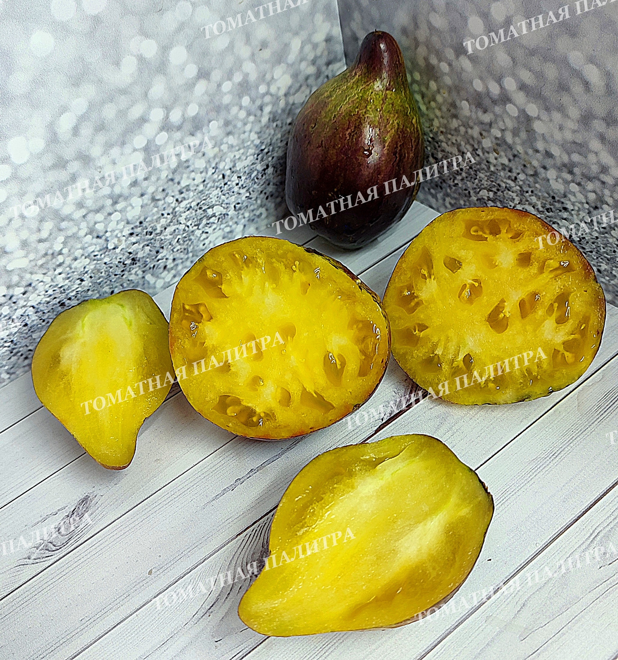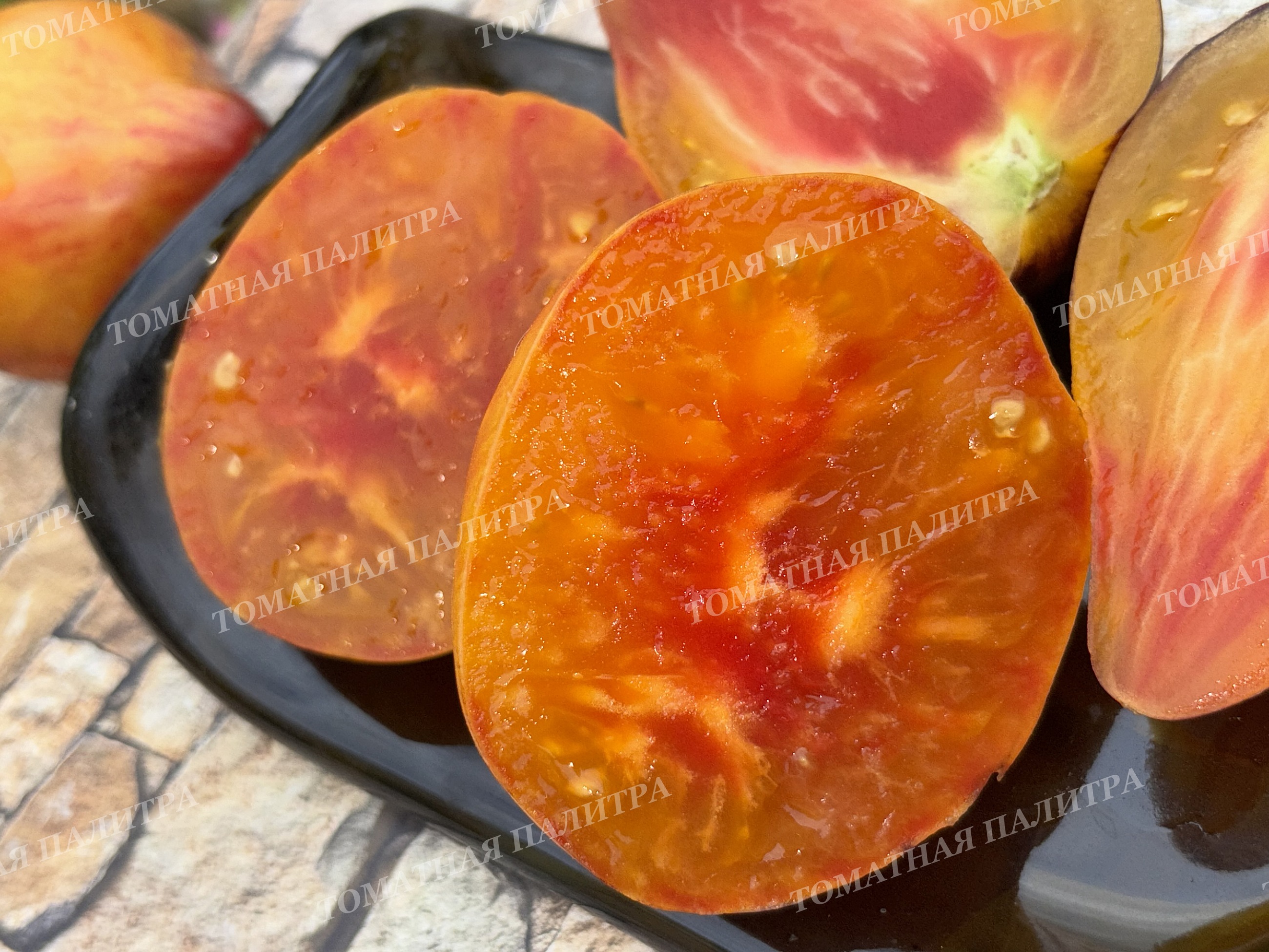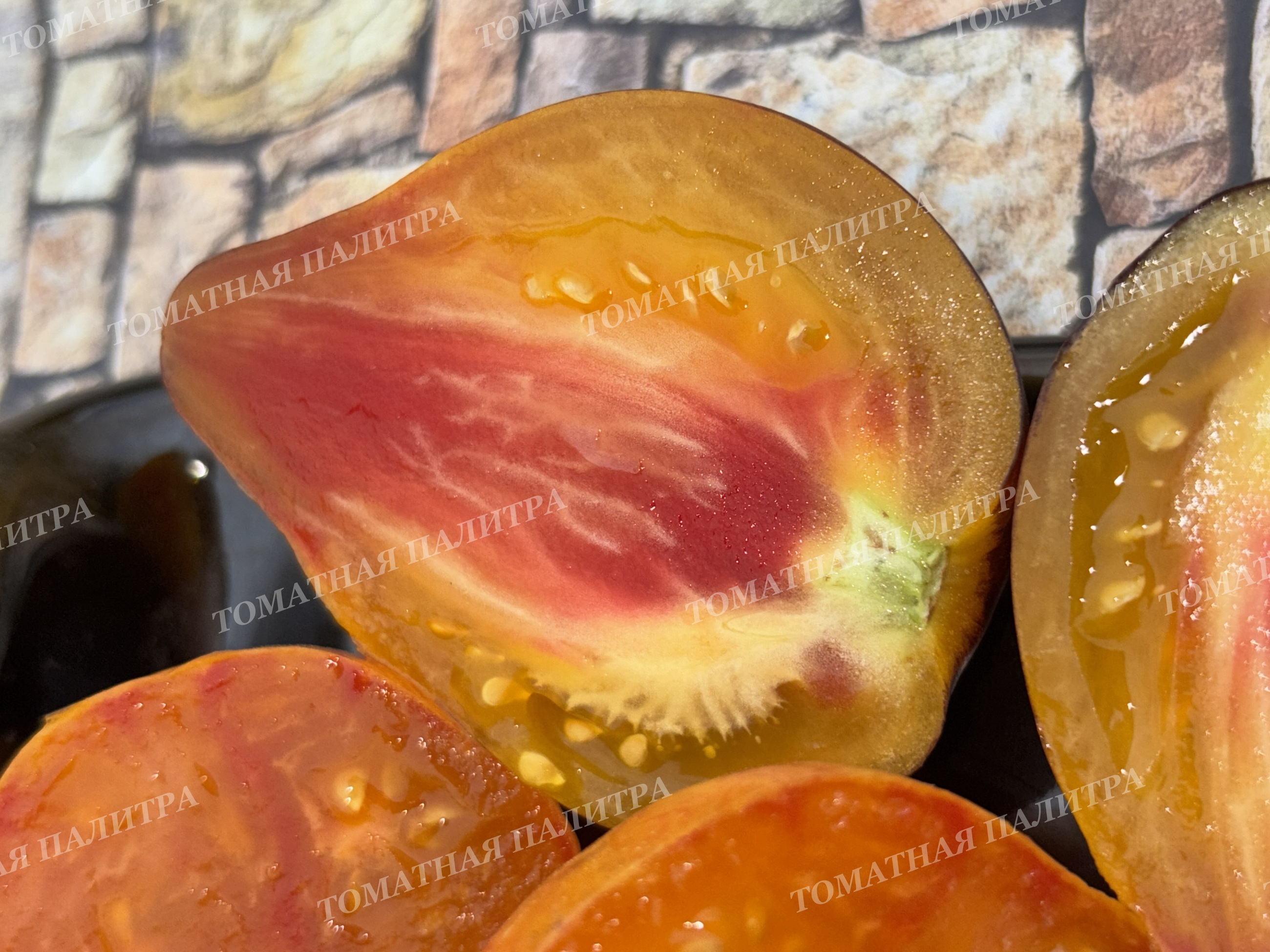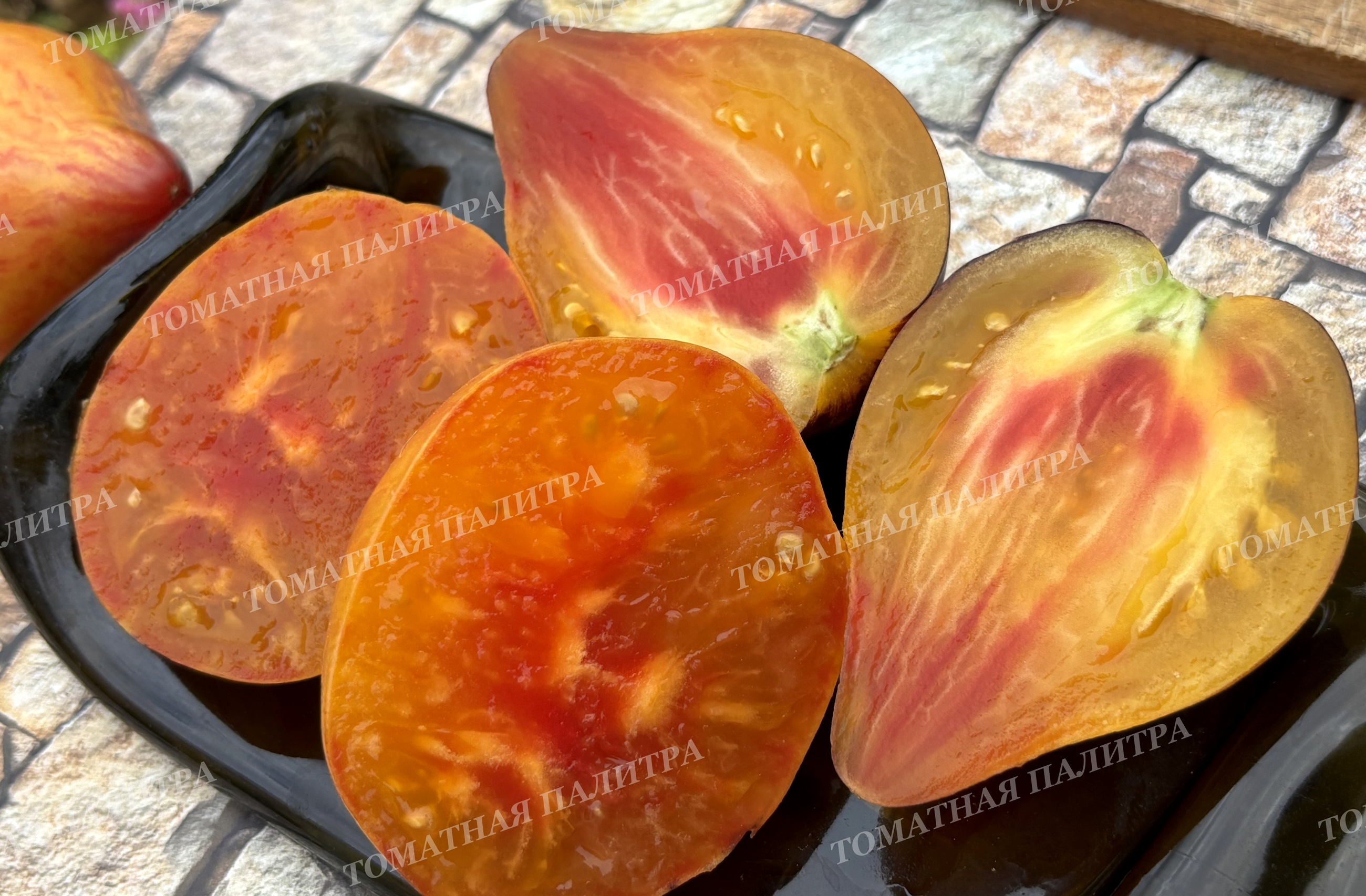Чем дольше томат висит на кусте, тем больше янтарной желтизны добавляется на боках томата, мякоть становится более мягкой - эдакой мармеладной структуры, и она расцветает яркими красками. На фото есть томаты в разрезе разной спелости. Хотите кушать разные по вкусу томатики – собирайте в разных стадиях созревания!