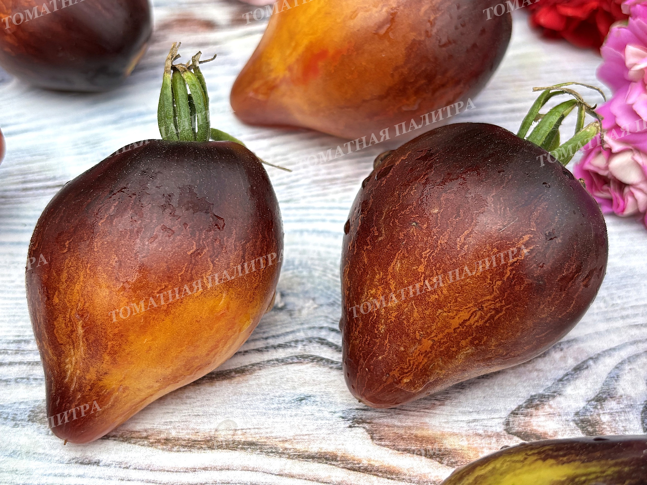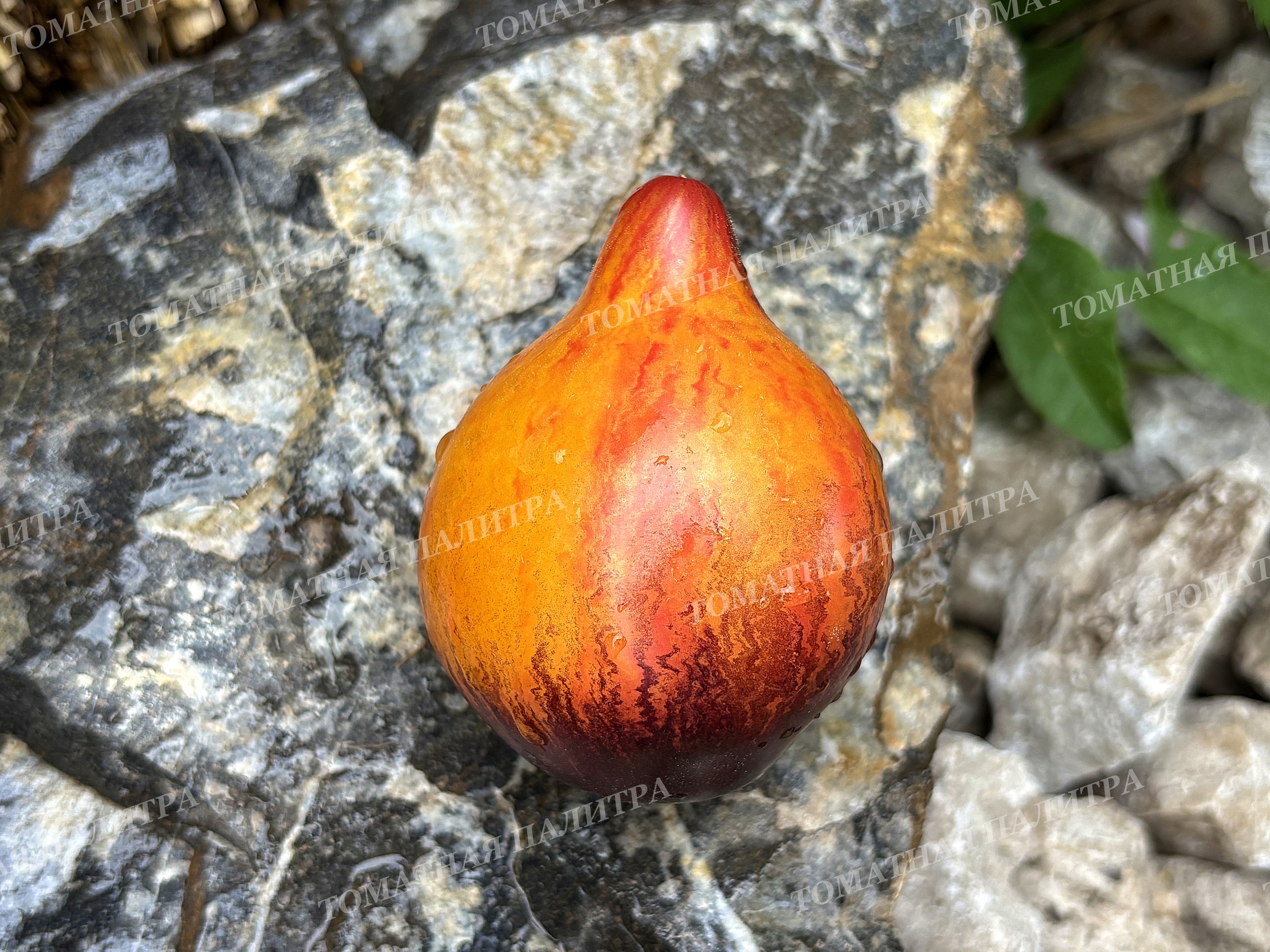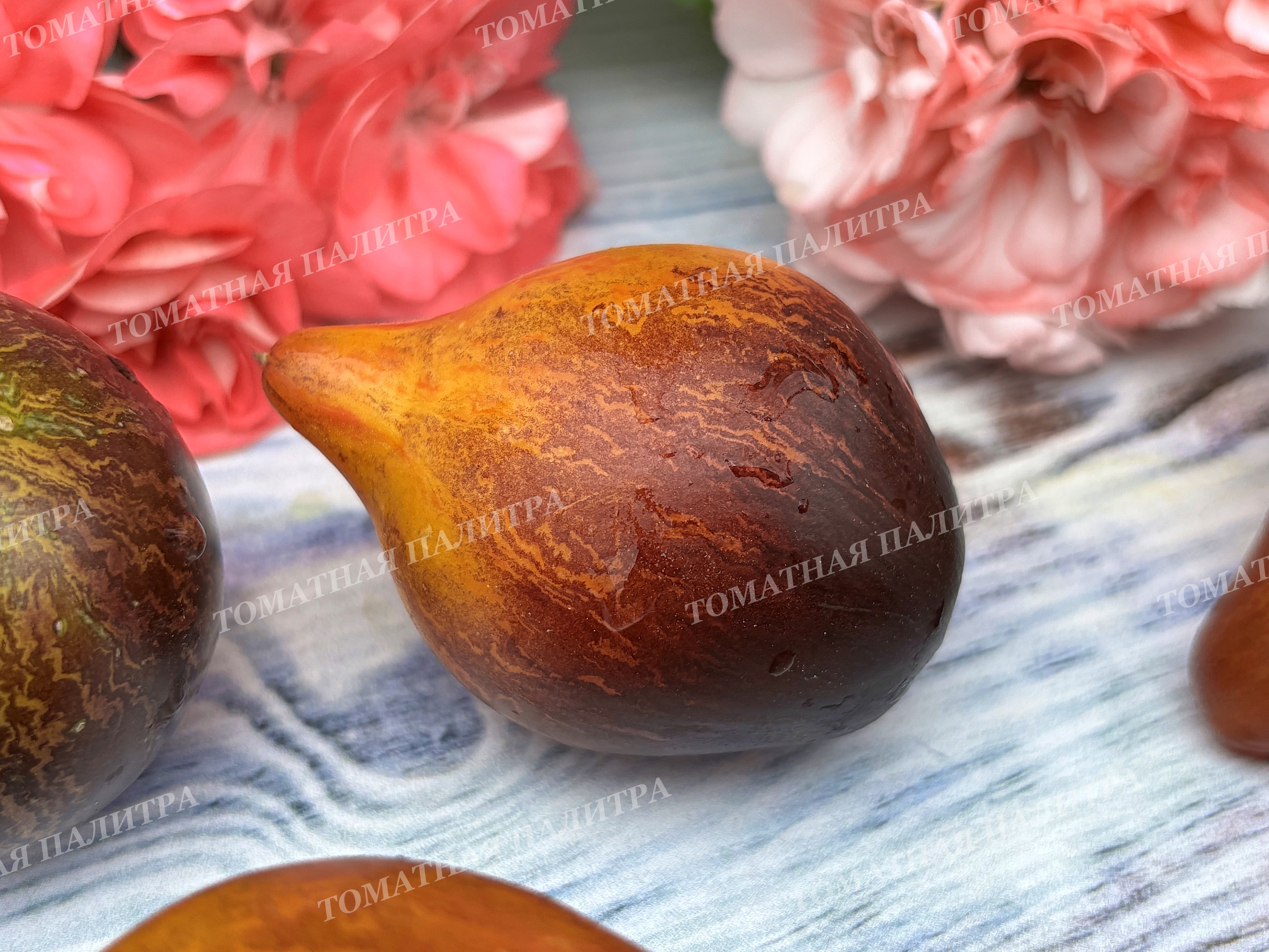 Плоды сердцевидные, янтарно-оранжевого цвета с щедрым напылением антоциана и роскошными зигзагообразными полосами и штрихами по всей поверхности до самого носика, который может быть и заостренным, и туповатым. Вес шедевров от 150 до 350 грамм.