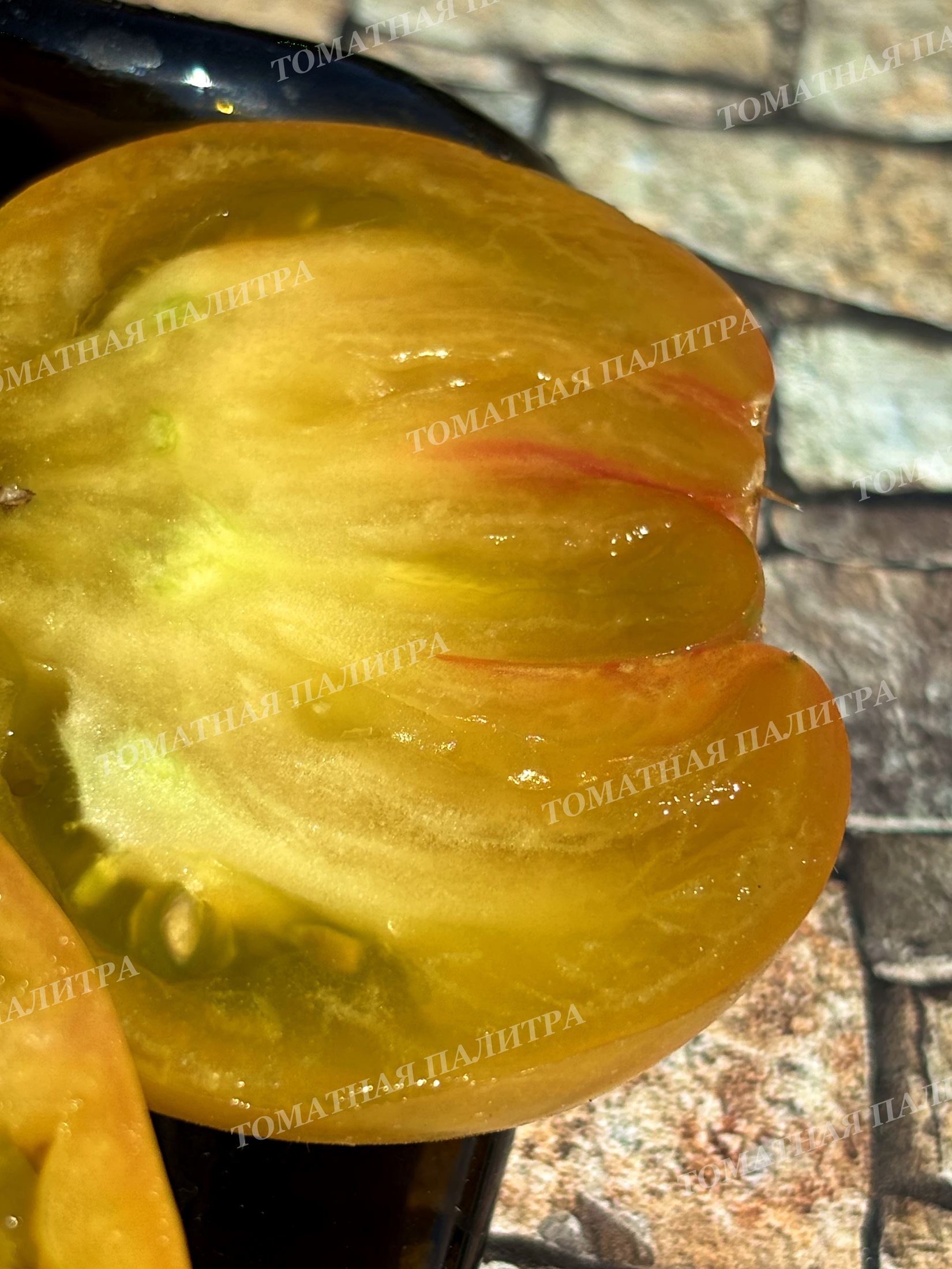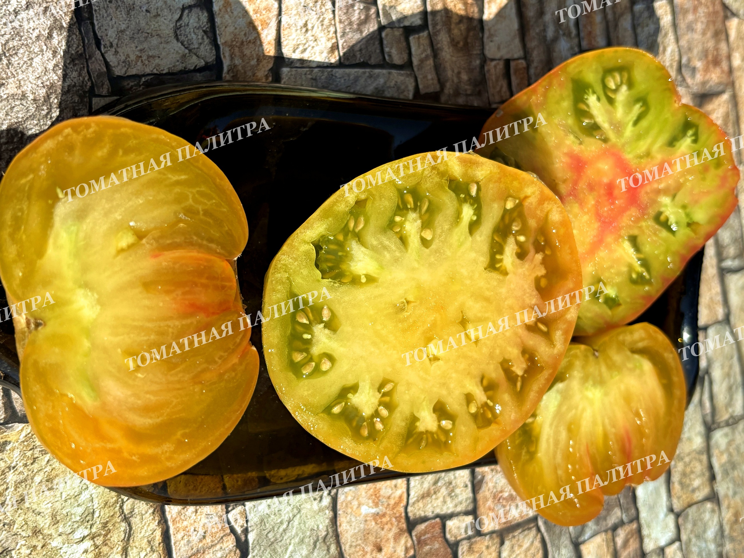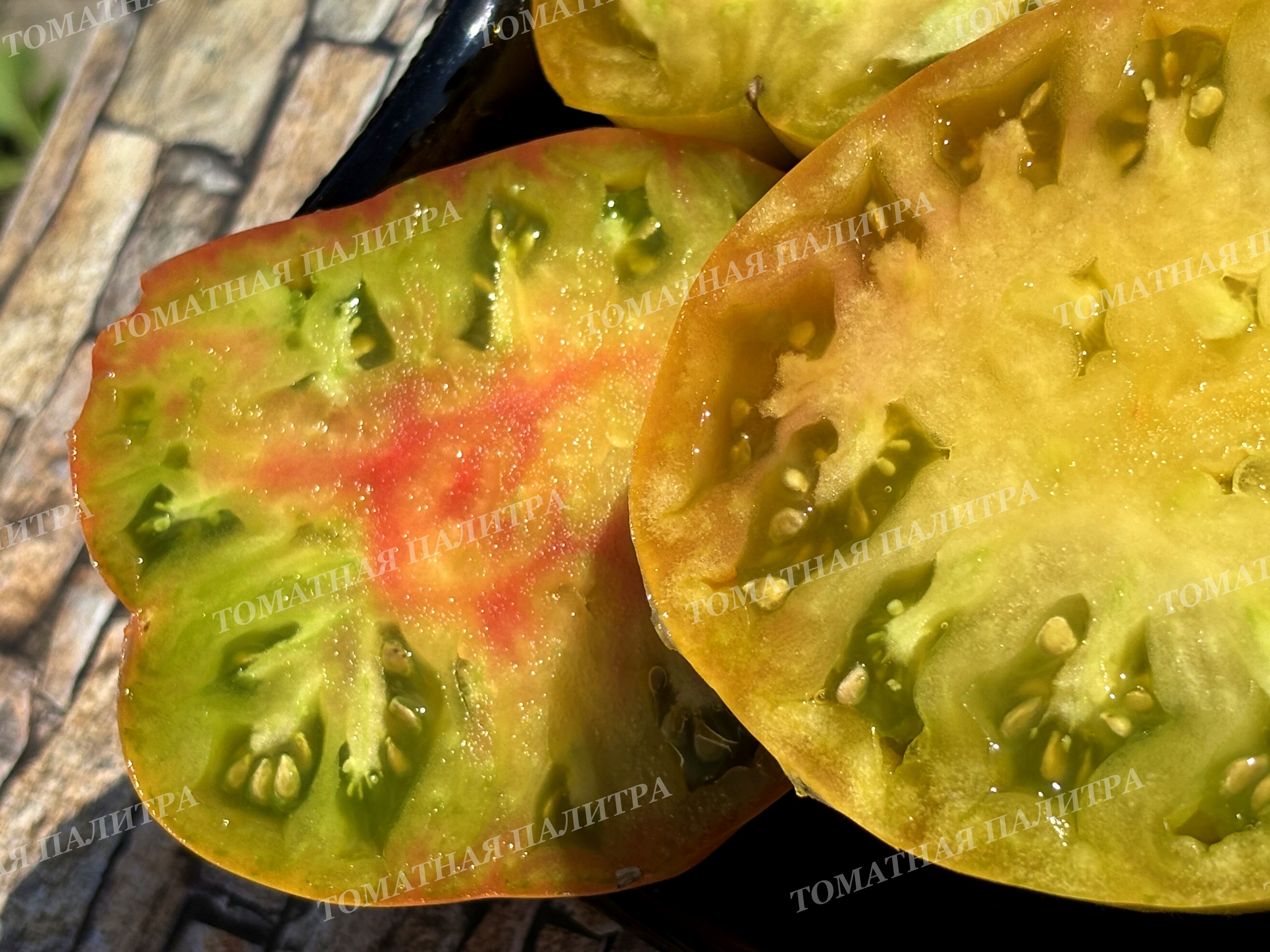 Все томаты крупные: от 300 до 500 гр. Мякоть красочно-триколорная, маслянистая и тающая во рту, семена в зелёном геле. Вкуснейшая!!!