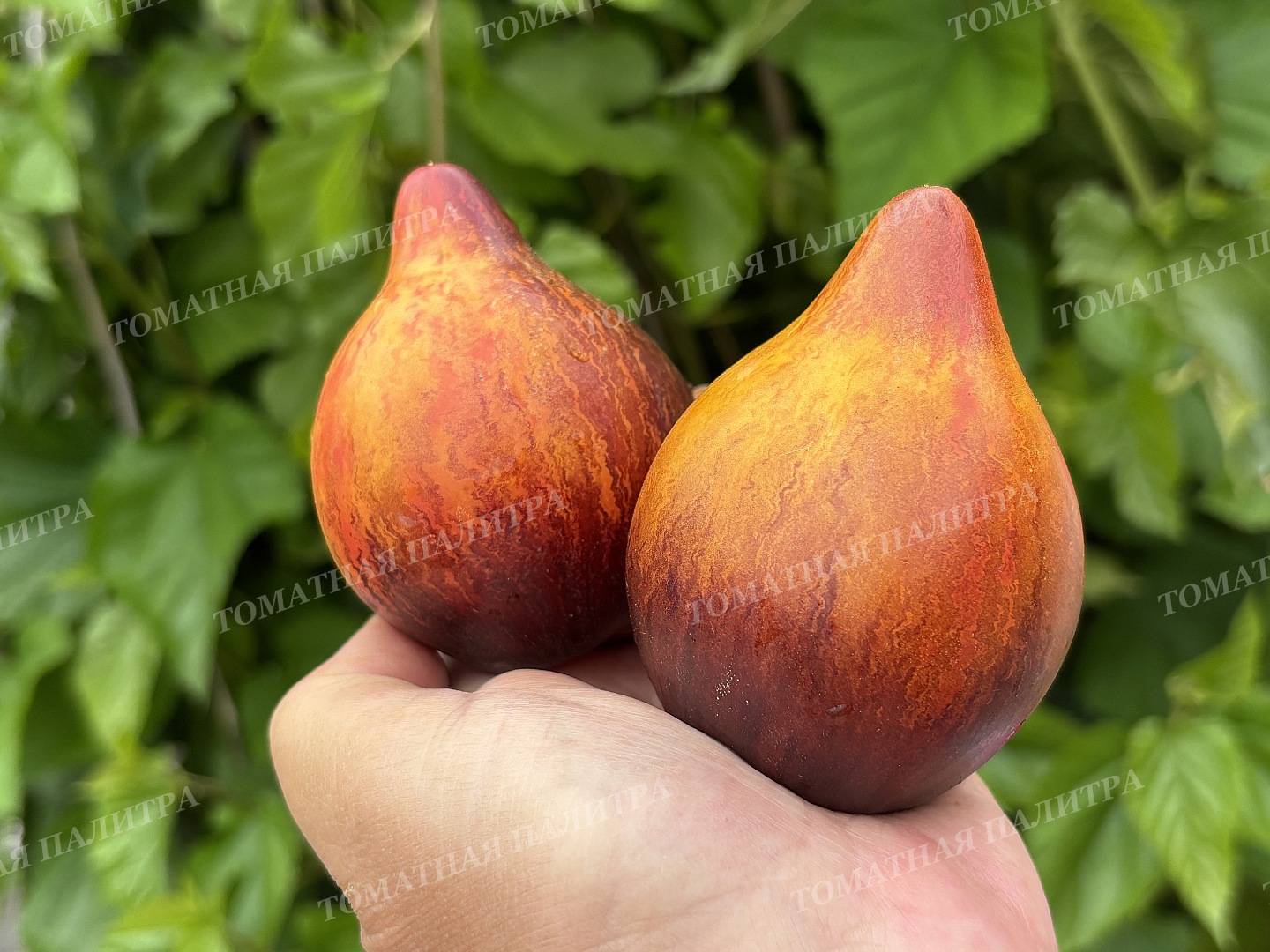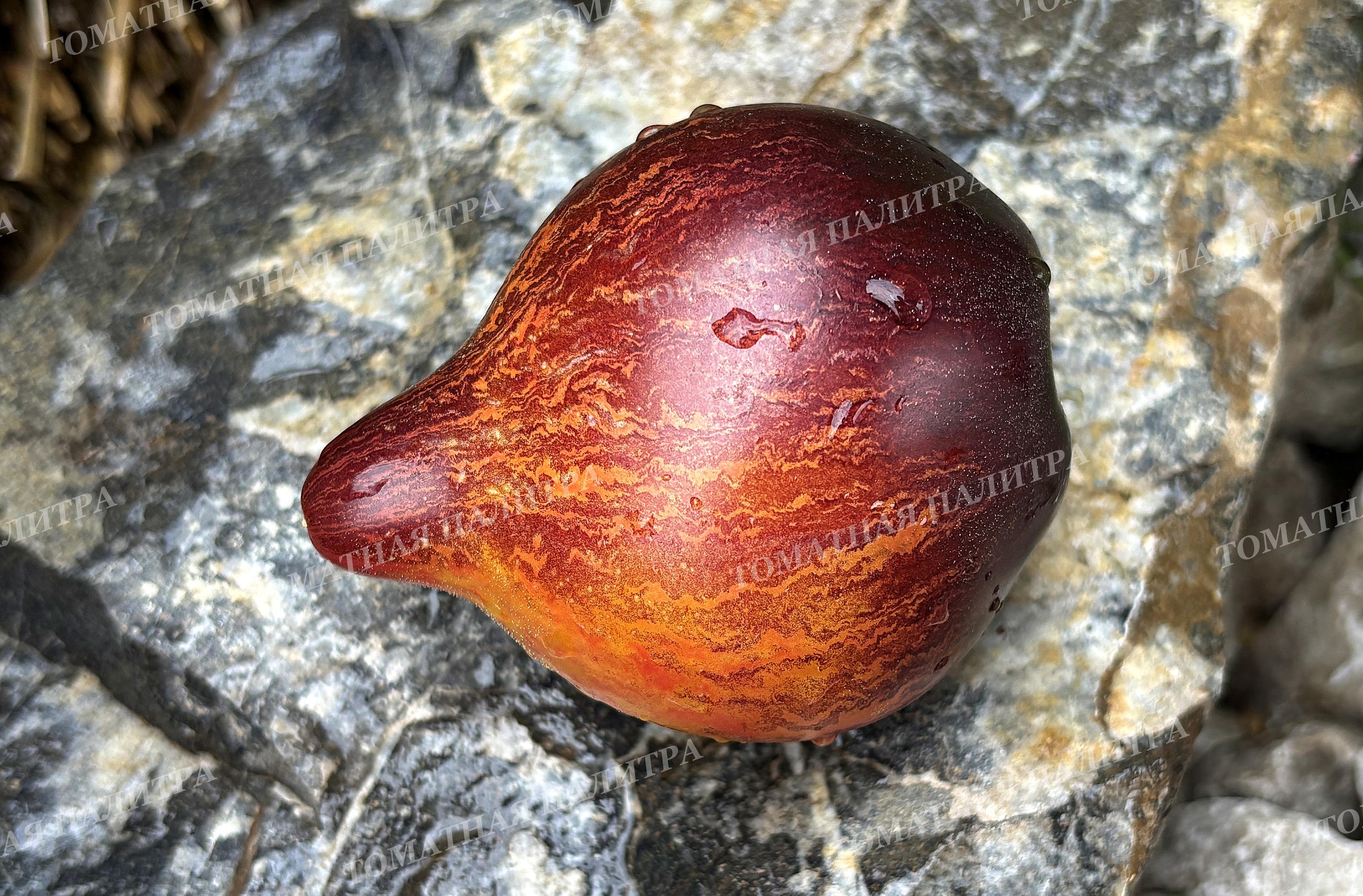 Плоды сердцевидные, янтарно-оранжевого цвета с щедрым напылением антоциана и роскошными зигзагообразными полосами и штрихами по всей поверхности до самого носика, который может быть и заостренным, и туповатым. Вес шедевров от 150 до 350 грамм.