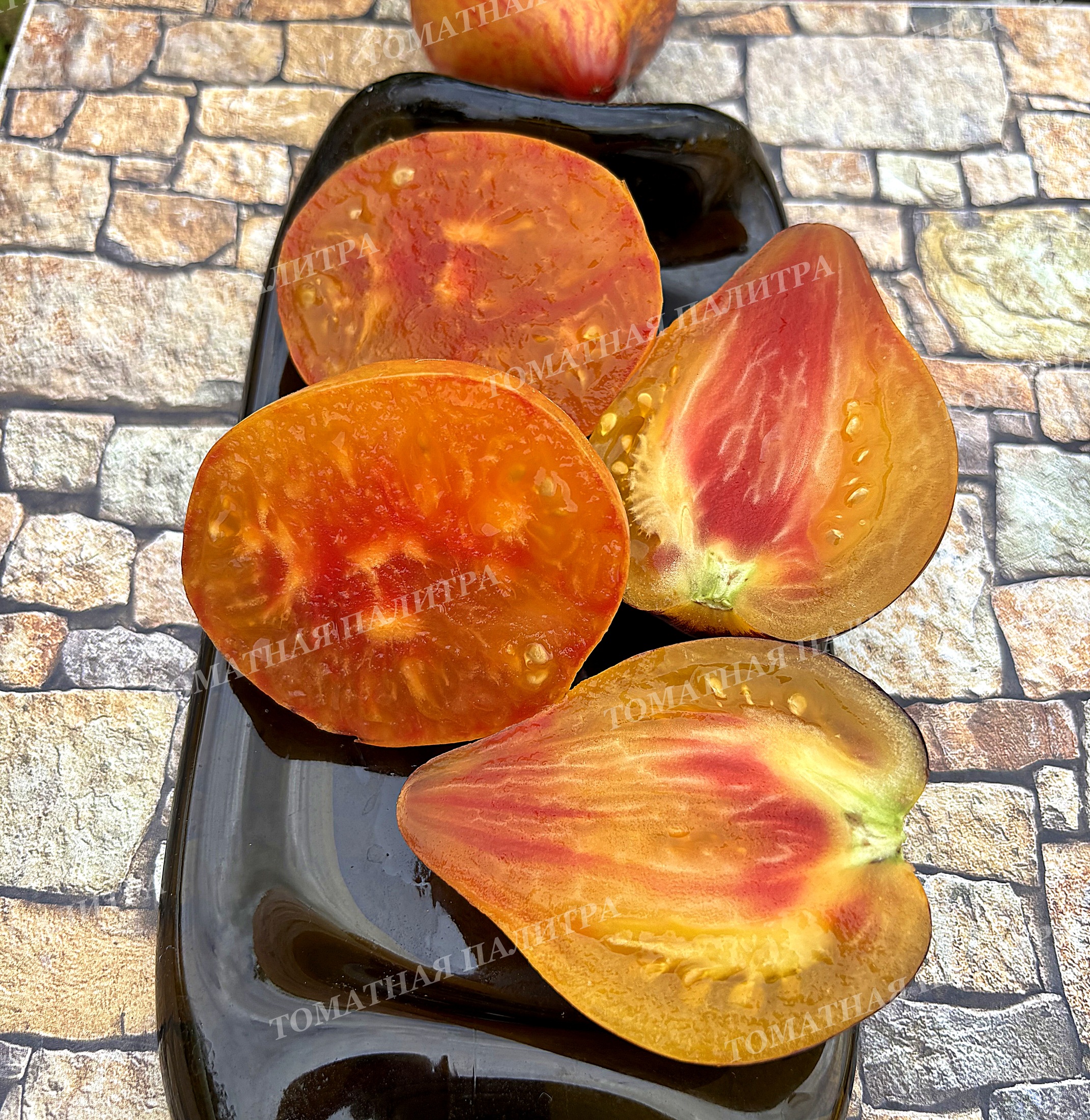 Чем дольше томат висит на кусте, тем больше янтарной желтизны добавляется на боках томата, мякоть становится более мягкой - эдакой мармеладной структуры, и она расцветает яркими красками. На фото есть томаты в разрезе разной спелости. Хотите кушать разные по вкусу томатики – собирайте в разных стадиях созревания!
