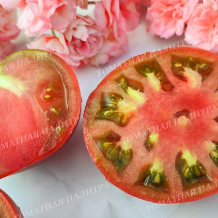 Мякоть вишнево-красная, донельзя мясистая, с большим количеством изумрудного геля в семенных камерах, где самих семян весьма мало. Зато тягучего сока предостаточно!