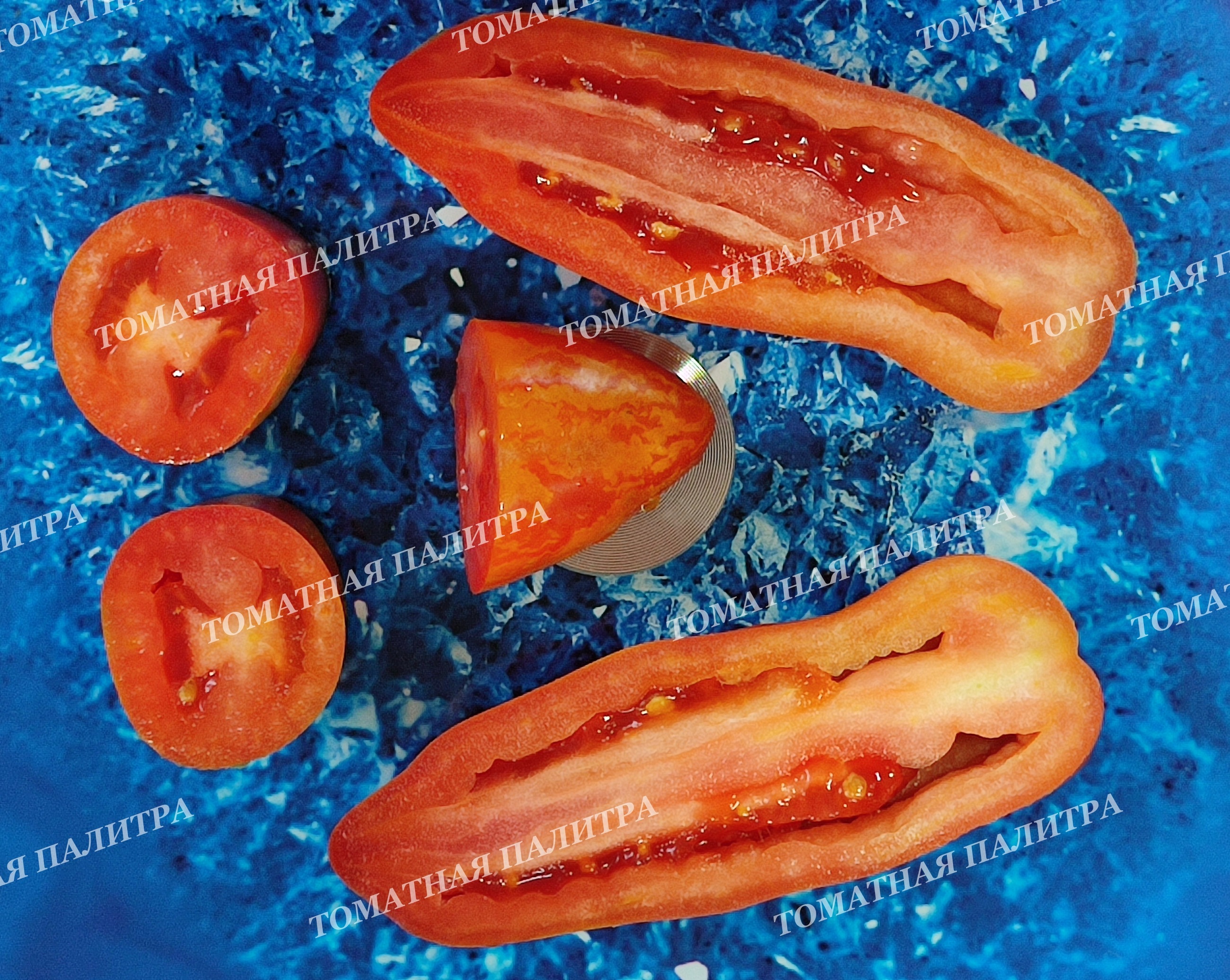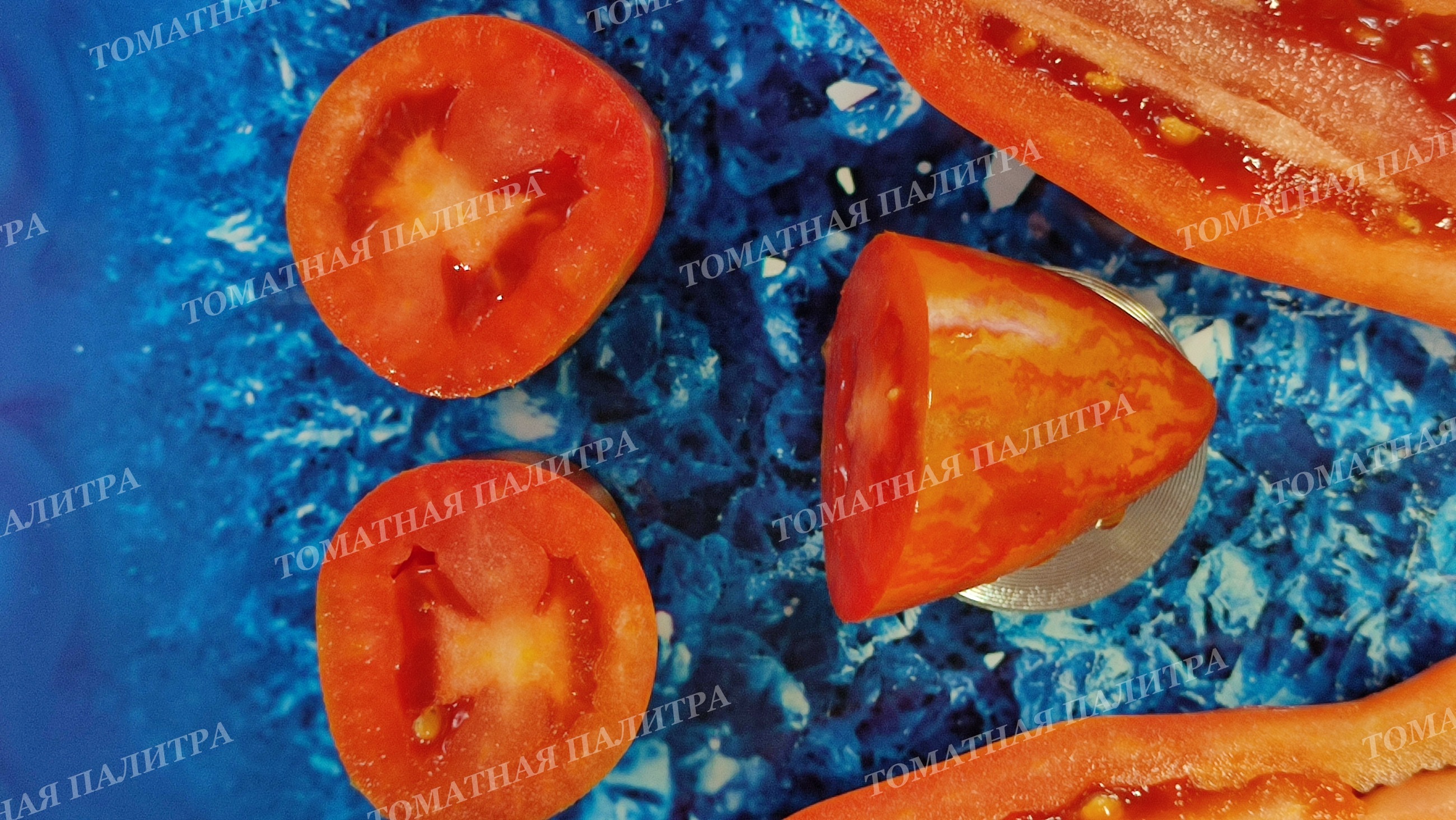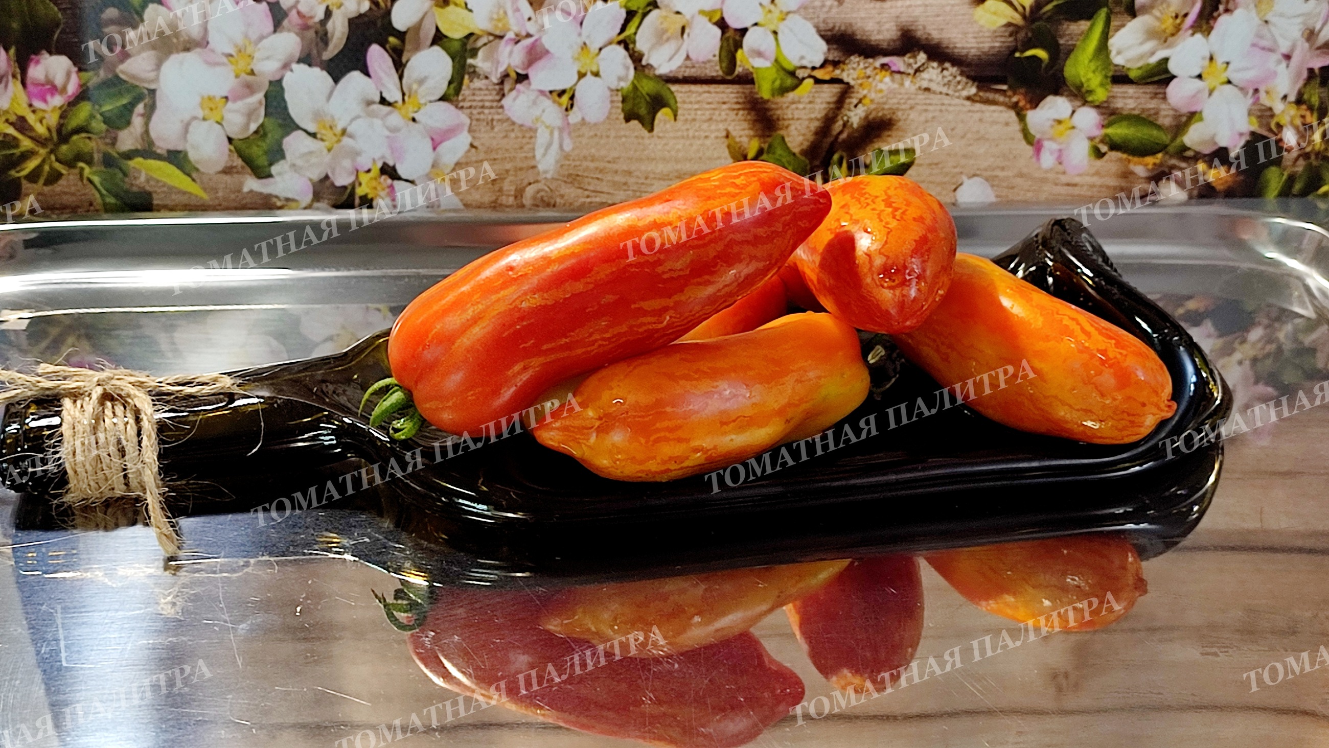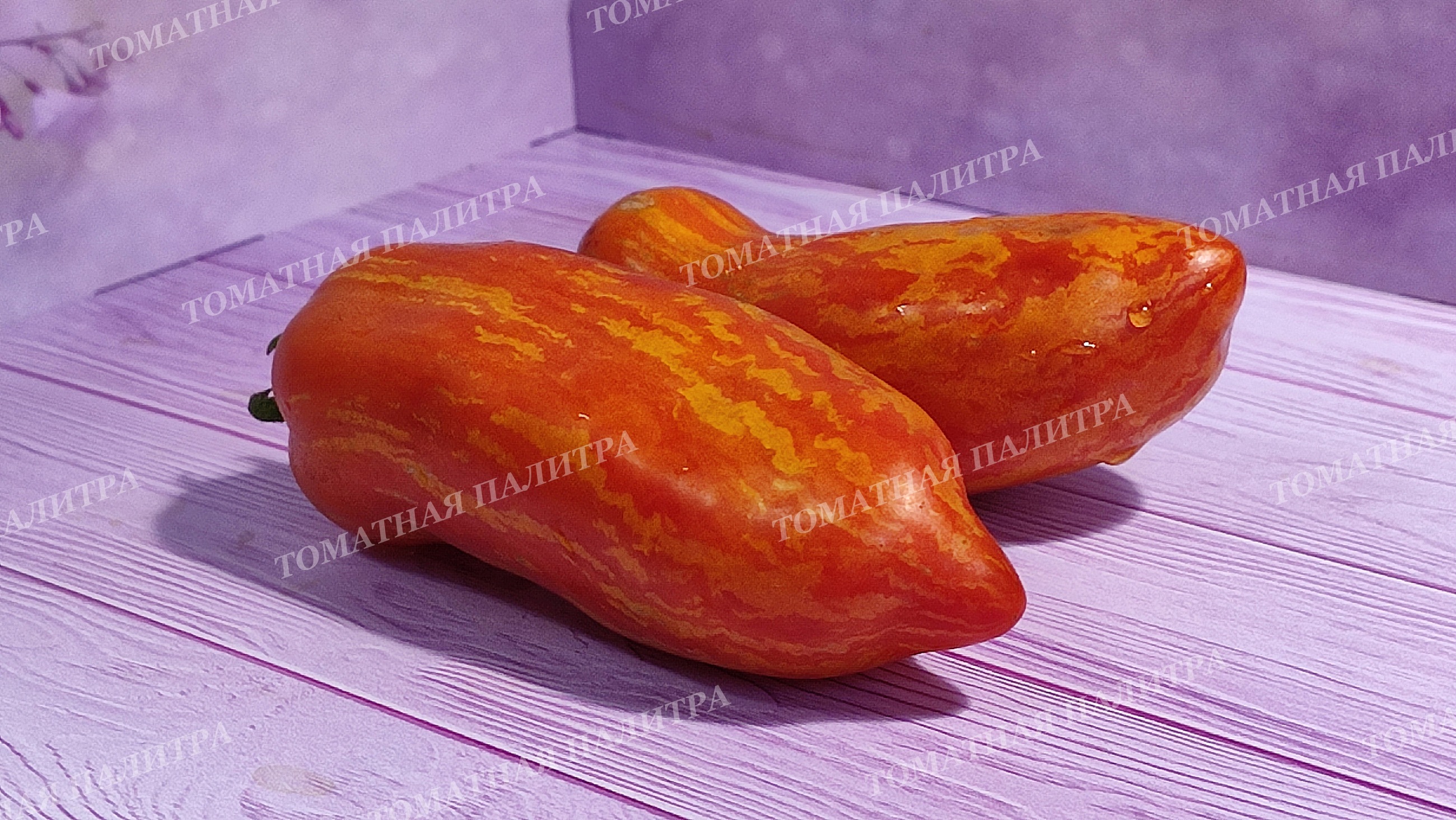 Внешность потрясающая – перцевидные томатики весом от 50 до 120 грамм имеют красно-оранжевый цвет, по которому разбегаются золотистые штрихи и полоски!
